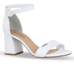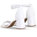 Sandália em couro burnish branco. De salto bloco alto encapado na mesma cor. Possui traseiro fechado com tira ajustável e fivela de metal encapada na cor preta. Gáspea com tira larga e enfeite com nome da marca.
