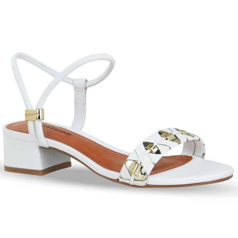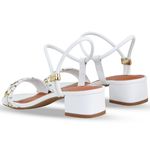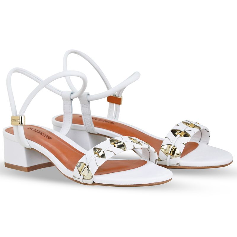 Sandália em couro burnish branco. De salto bloco médio. Possui traseiro aberto com metal na lateral que possibilita o ajuste ao tornozelo. Gáspea com tira fina e detalhe em metal dourado.