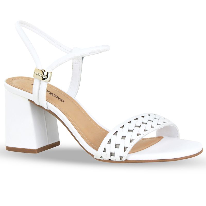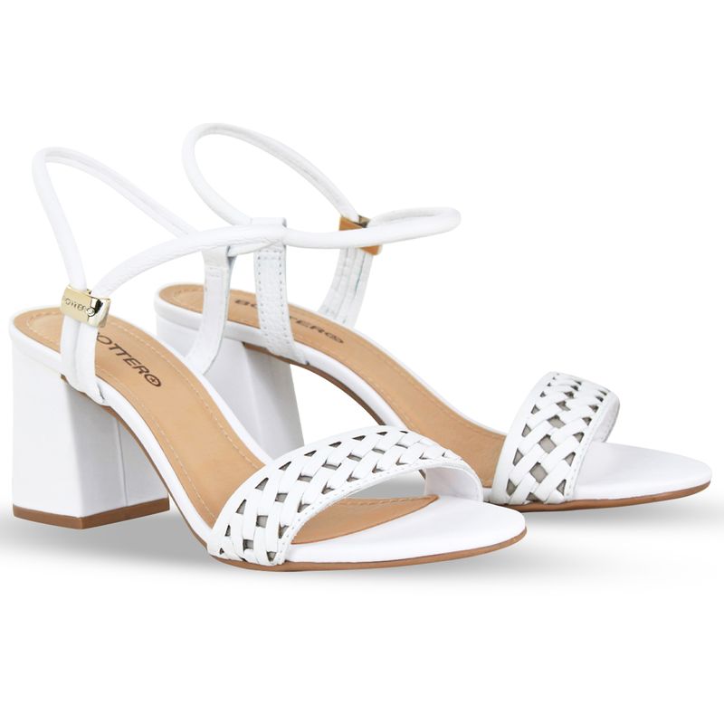 Sandália em couro burnish branco. De salto bloco alto. Possui traseiro aberto com detalhe em metal na lateral externa que possibilita o ajuste da tira que envolve o pé. Gáspea com detalhe tramado.