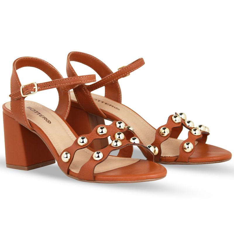 Sandália em couro burnish caramelo. De salto bloco alto. Possui traseiro aberto com tira ajustável e fivela de metal dourada. Gáspea com recortes nas laterais e enfeite de metal dourado.