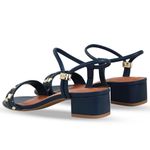 Sandália em couro burnish marinho. De salto bloco médio. Possui traseiro aberto com metal na lateral que possibilita o ajuste ao tornozelo. Gáspea com tira fina e detalhe em metal dourado.