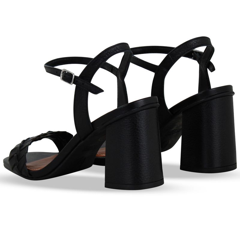 Sandália em couro burnish preto. De salto bloco alto encapado. Possui traseiro aberto com tira ajustável e fivela de metal prata. Gáspea com detalhe em couro metalizado roma preto transpassado.