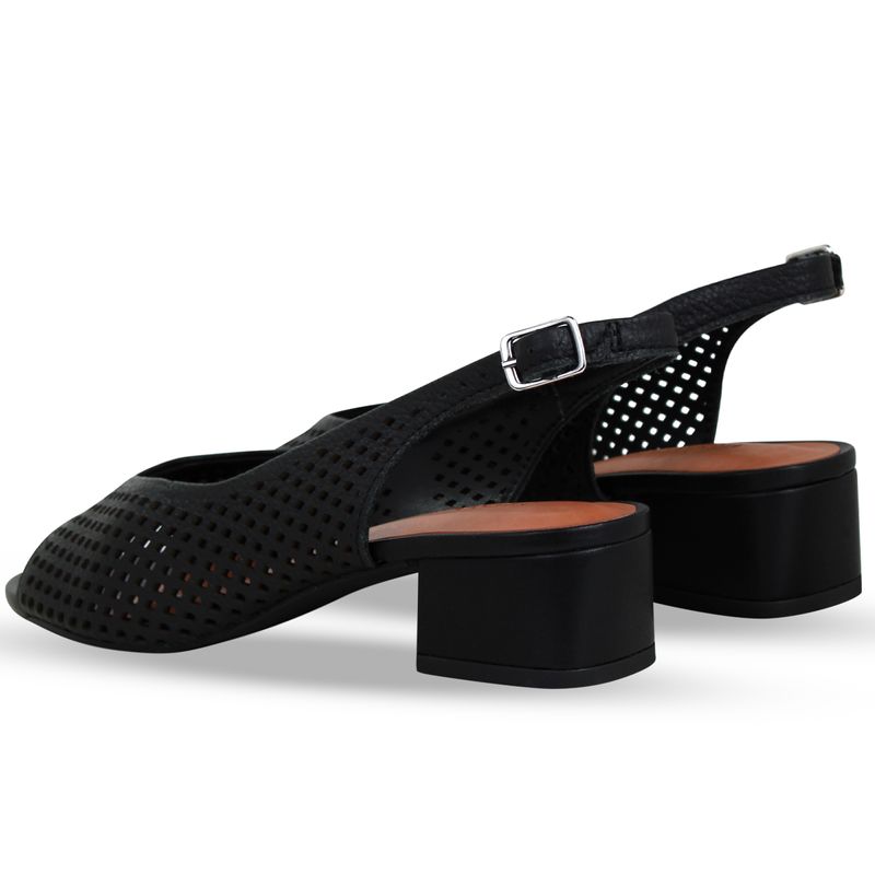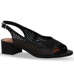 Sandália em couro burnish preto. De salto bloco médio. Possui traseiro aberto com tira ajustável e fivela de metal prata. Gáspea inteira com detalhes a laser, trazendo charme ao modelo.