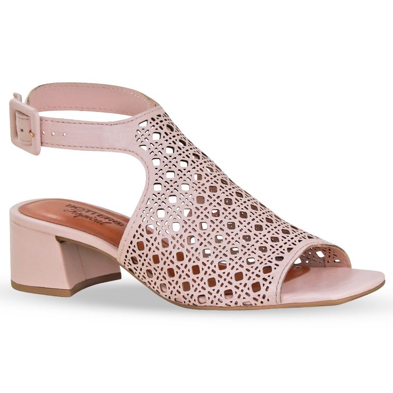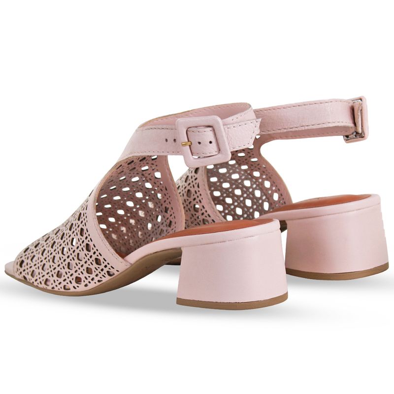 Sandália em couro burnish rosa pastel. De salto bloco médio. De traseiro aberto com tira ajustável e fivela de metal dourada. Possui gáspea com detalhes a laser, trazendo charme e delicadeza ao modelo.
