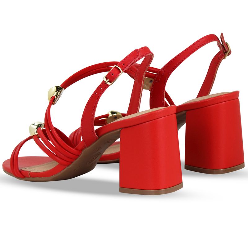 Sandália em couro burnish vermelho. De salto bloco alto. Possui traseiro aberto com tira ajustável e fivela de metal dourado. Gáspea com tiras finas transpassadas e metal dourado, trazendo delicadeza ao modelo.