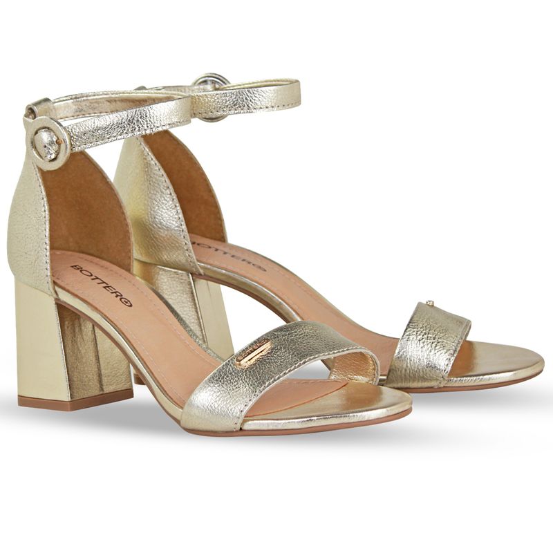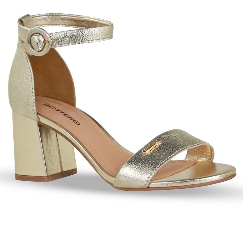 Sandália em couro metalizado roma dourado. De salto bloco alto encapado na mesma cor. Possui traseiro fechado com tira ajustável e fivela de metal encapada na cor preta. Gáspea com tira larga e enfeite com nome da marca.