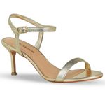 Sandália em couro metalizado roma dourado. De salto alto fino. Possui traseiro aberto com tira ajustável e fivela de metal prata. Gáspea com delicada tira fina sobre o pé.