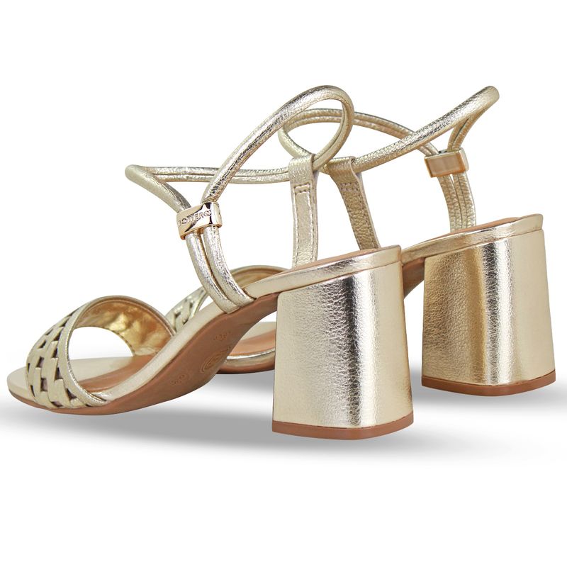 Sandália em couro metalizado roma dourado. De salto bloco alto. Possui traseiro aberto com detalhe em metal na lateral externa que possibilita o ajuste da tira que envolve o pé. Gáspea com detalhe tramado.