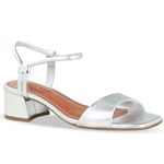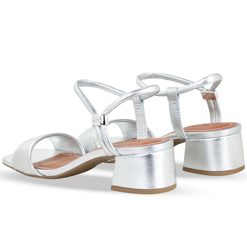 Sandália em couro metalizado roma prata. De salto bloco baixo. De traseiro aberto com tiras inteiras e metal que facilita o ajuste ao pé. Gáspea em tira larga. Modelo clássico e indispensável.