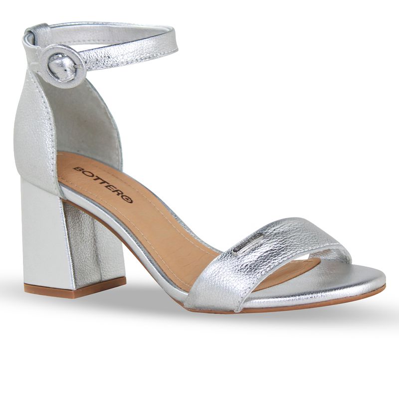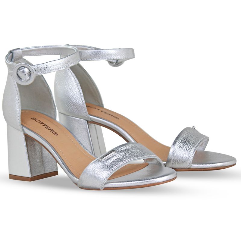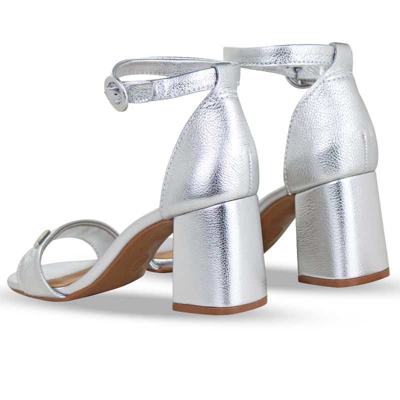 Sandália em couro metalizado roma prata. De salto bloco alto encapado na mesma cor. Possui traseiro fechado com tira ajustável e fivela de metal encapada na cor preta. Gáspea com tira larga e enfeite com nome da marca.