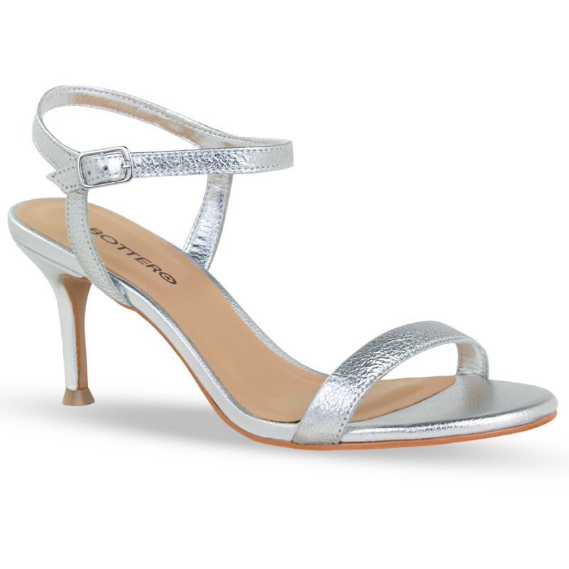 Sandália em couro metalizado roma prata. De salto alto fino. Possui traseiro aberto com tira ajustável e fivela de metal prata. Gáspea com delicada tira fina sobre o pé.