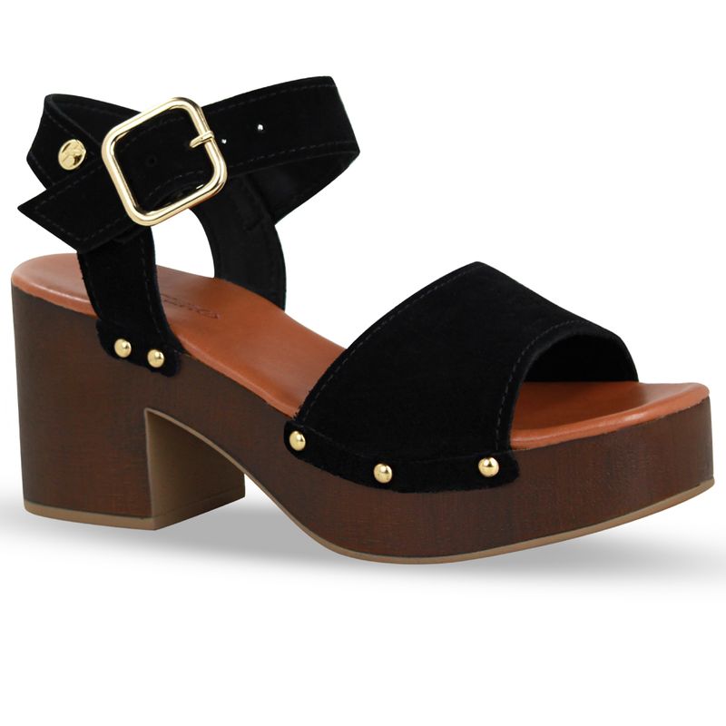 Sandália plataforma em couro camurça preto. De salto alto em tons de madeira, possui um solado extremamente leve. Traseiro aberto com tira ajustável e fivela de metal dourada. Gáspea inteira, trazendo conforto e firmeza ao modelo