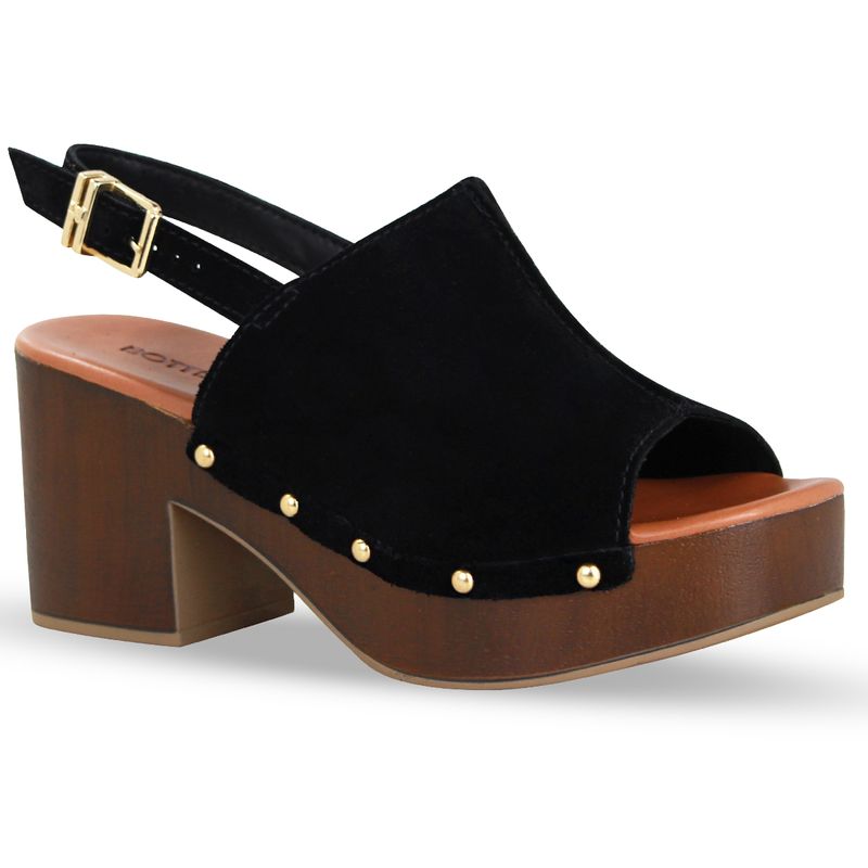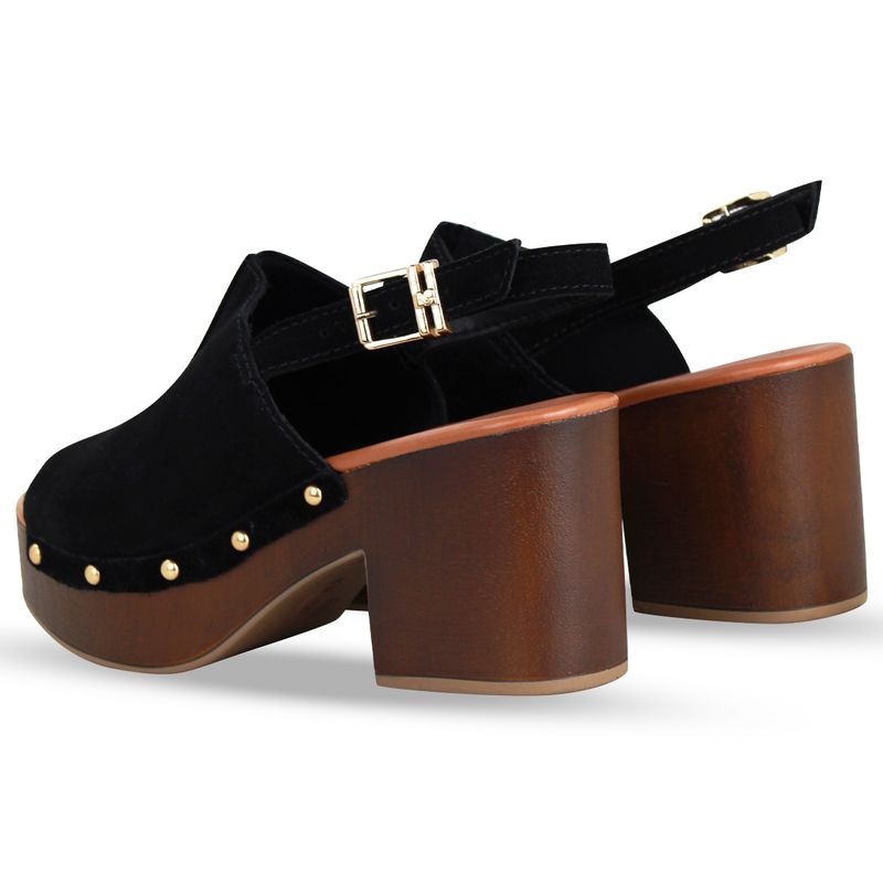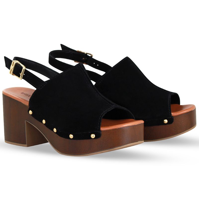 Sandália plataforma em couro camurça preto. De salto alto em tons de madeira, possui um solado extremamente leve. Traseiro aberto com tira ajustável e fivela de metal dourada. Gáspea inteira com abertura deixando os dedos à mostra.