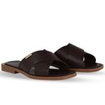 Sandália rasteira em couro atanado marrom. De solado rasteiro na cor natural. Possui gáspea com tiras largas transpassadas sobre o pé.