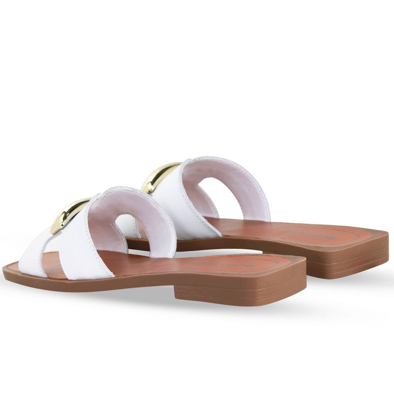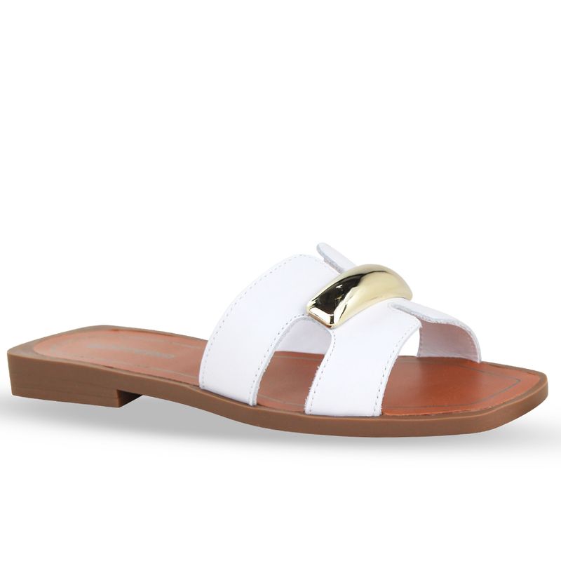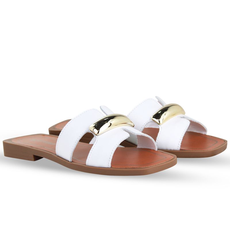 Sandália rasteira em couro atanado napoli branco. De solado rasteiro bege. Gáspea com recortes nas laterais e enfeite de metal dourado.