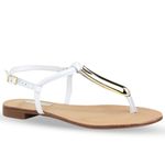 Sandália rasteira em couro atanado napoli branco. De solado rasteiro. Possui traseiro aberto com tira ajustável e fivela de metal dourado. Gáspea aberta com detalhe em metal sobre o pé.