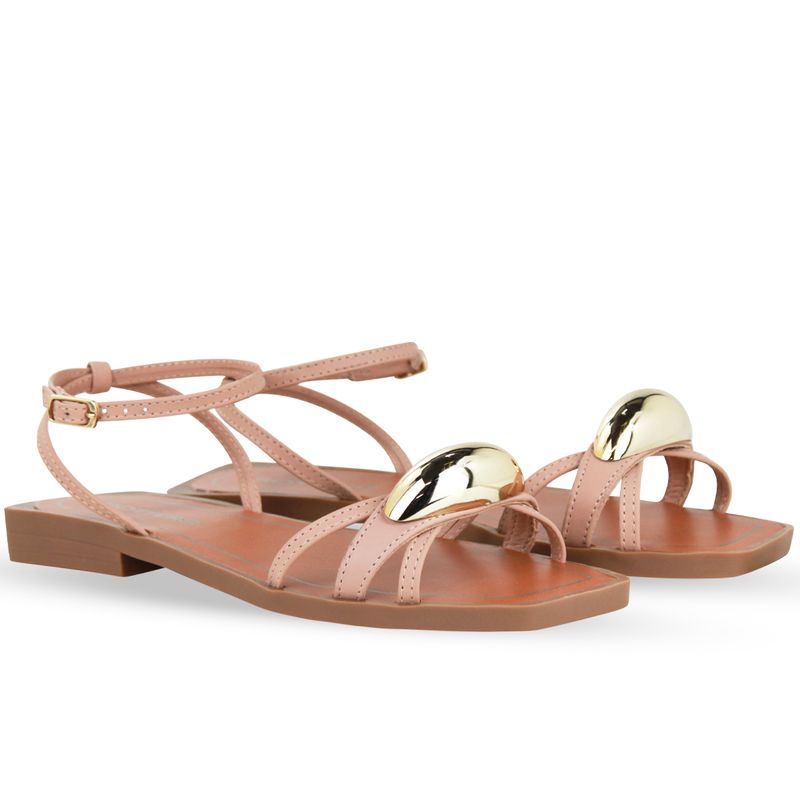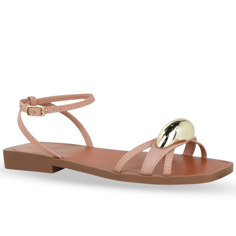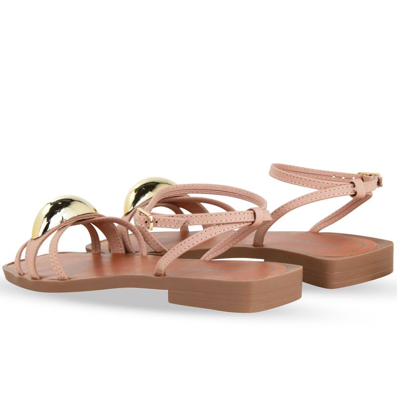 Sandália rasteira em couro atanado napoli brown sugar. De solado rasteiro bege. Possui traseiro aberto com tira ajustável e fivela de metal dourada. Gáspea com tiras finas e detalhe em metal dourado sobre o pé.