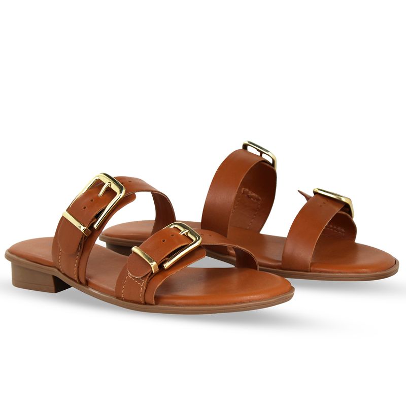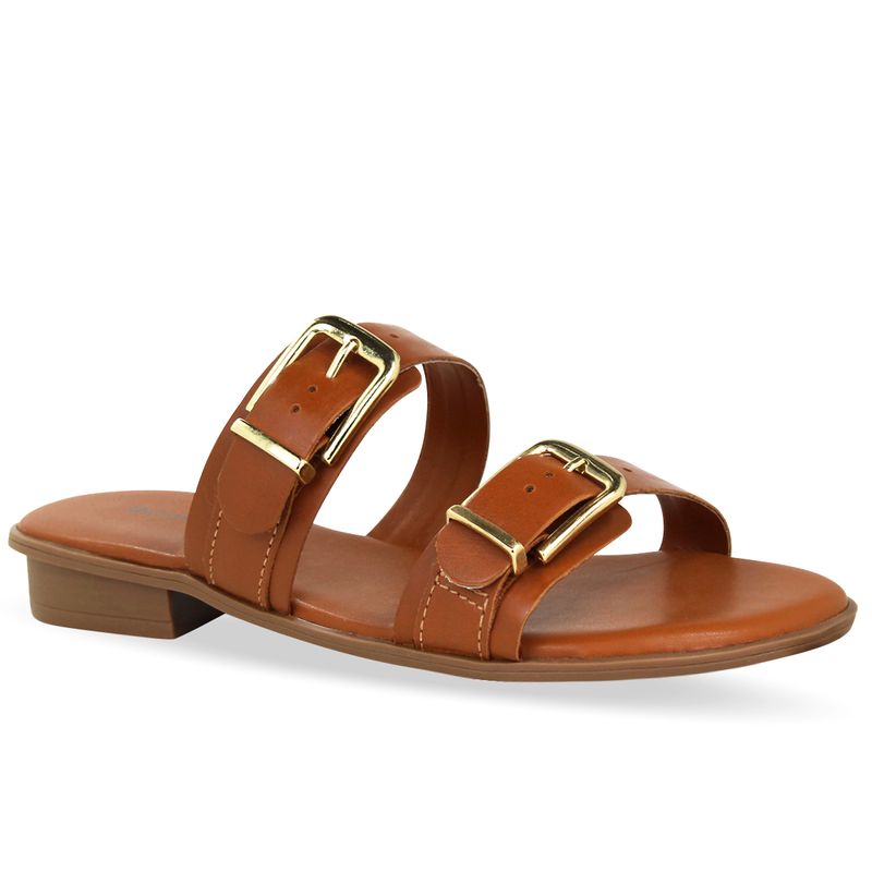 Sandália rasteira em couro atanado napoli caramelo. De solado rasteiro. Tiras ajustáveis sobre o pé com fivela de metal dourada.