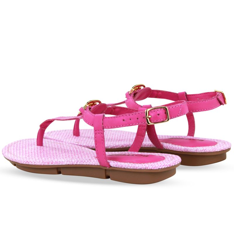 Sandália rasteira em couro atanado napoli hot pink. De solado rasteiro com palmilha em palha sintética. Possui fechamento com tira ajustável e fivela de metal dourado. Detalhes de enfeite em metal dourado sobre o pé.