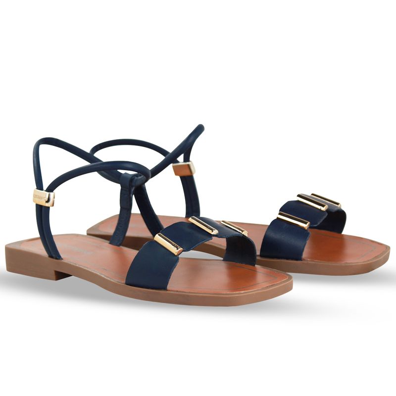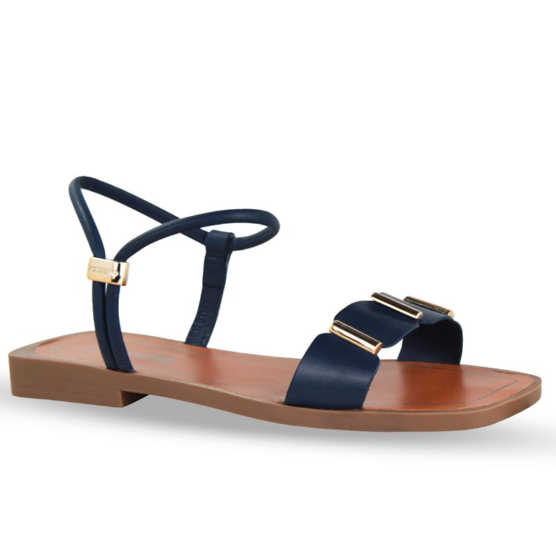 Sandália rasteira em couro atanado napoli marinho. De solado rasteiro bege. Possui traseiro aberto com detalhe em metal na lateral externa que possibilita o ajuste da tira que envolve o pé. Gáspea com tira larga e detalhe em metal dourado.