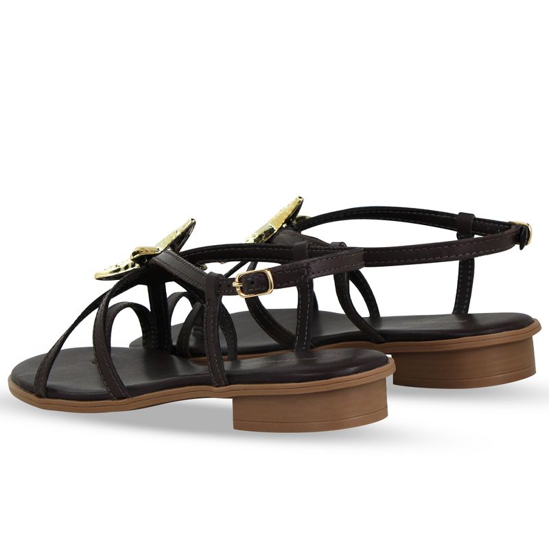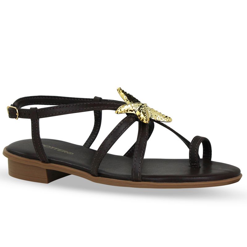 Sandália rasteira em couro atanado napoli marrom. De solado rasteiro. Traseiro aberto com tira ajustável e fivela de metal dourada. Possui tiras finas na gáspea, tira fina prendendo o dedo com elástico que auxilia no ajuste. Detalhe em estrela dourada sobre o pé.