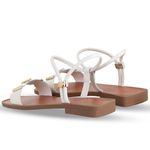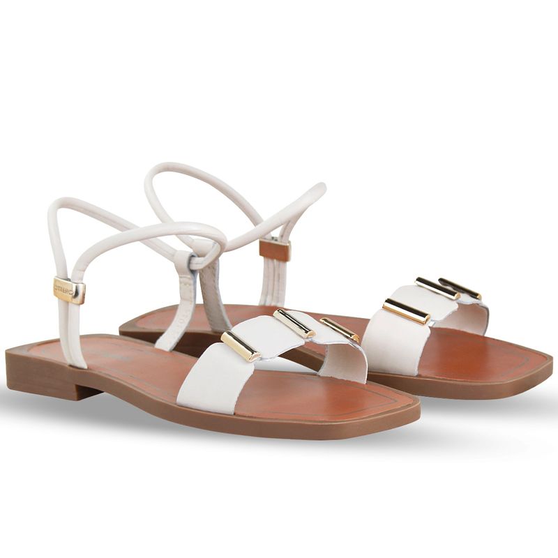 Sandália rasteira em couro atanado napoli off white. De solado rasteiro bege. Possui traseiro aberto com detalhe em metal na lateral externa que possibilita o ajuste da tira que envolve o pé. Gáspea com tira larga e detalhe em metal dourado.
