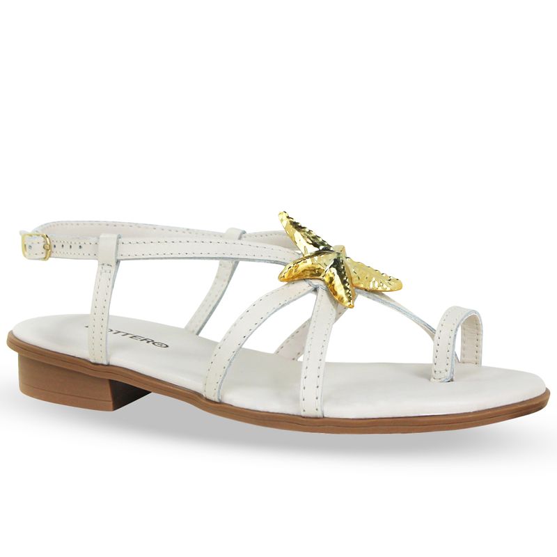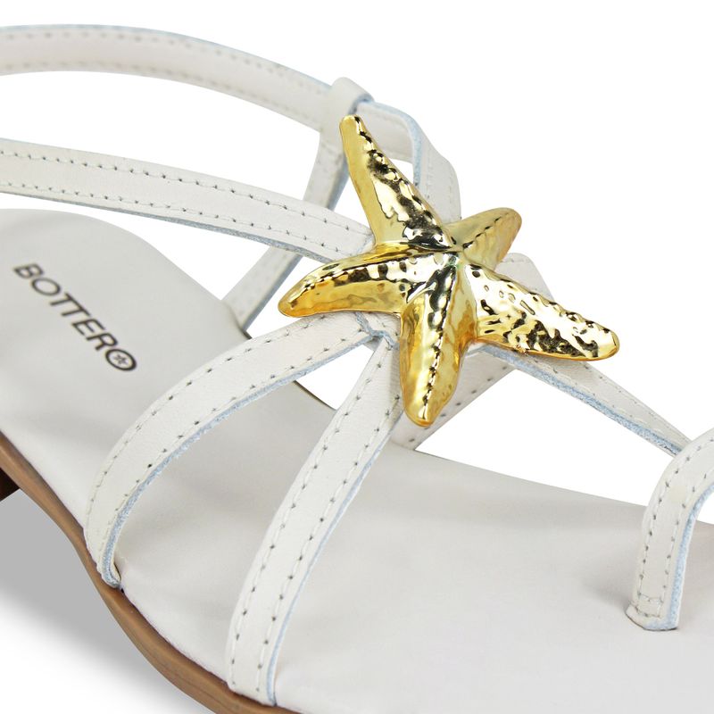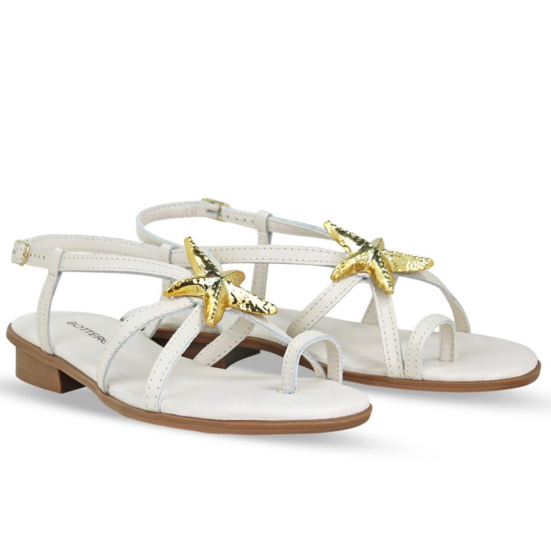 Sandália rasteira em couro atanado napoli off white. De solado rasteiro. Traseiro aberto com tira ajustável e fivela de metal dourada. Possui tiras finas na gáspea, tira fina prendendo o dedo com elástico que auxilia no ajuste. Detalhe em estrela dourada sobre o pé.
