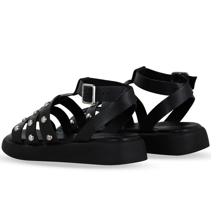 Sandália rasteira em couro atanado napoli preta. De solado rasteiro com palminha confortável. Possui traseiro aberto com tira ajustável e fivela de metal prata. Gáspea com tiras transpassadas e enfeite de metal prata sobre as tiras.