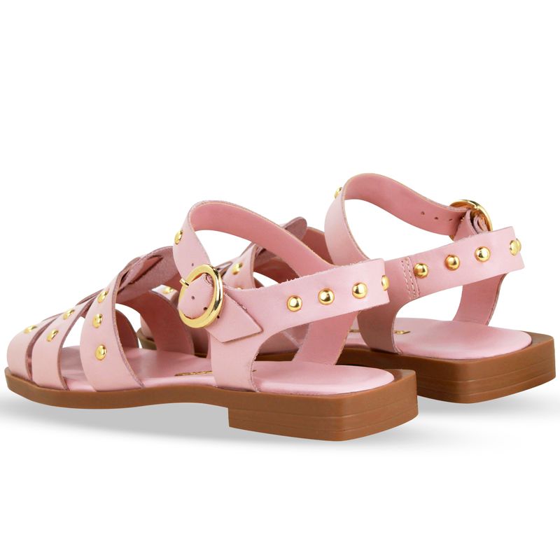 Sandália rasteira em couro atanado napoli quartz rosa. De solado rasteiro na cor natural com palmilha na cor quartz rosa. O modelo possui tira larga central sobre o pé e tiras largas na horizontal com enfeites em metal dourado, exibindo parte do pé. Possui traseiro aberto com detalhe em metal dourado e tira ajustavel e fivela de metal dourado.