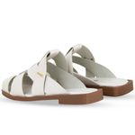 Sandália rasteira em couro atanado off white. De solado rasteiro na cor natural com palmilha na cor off white. O modelo possui tira larga central sobre o pé e tiras largas na horizontal, exibindo parte do pé.