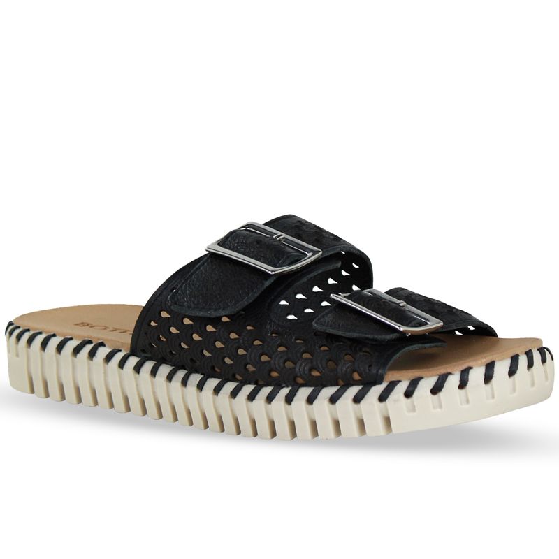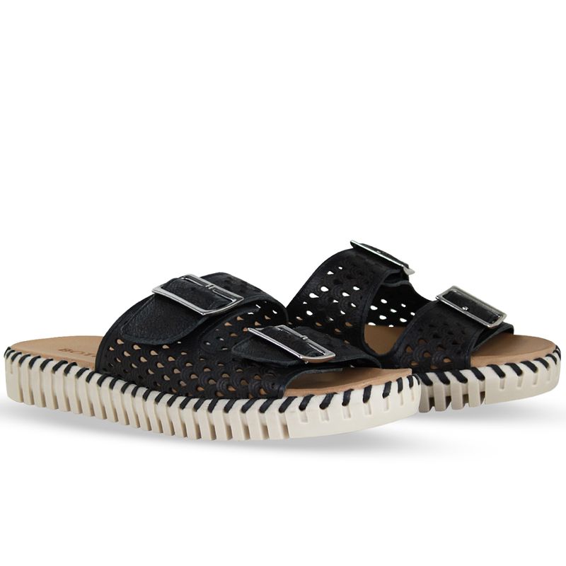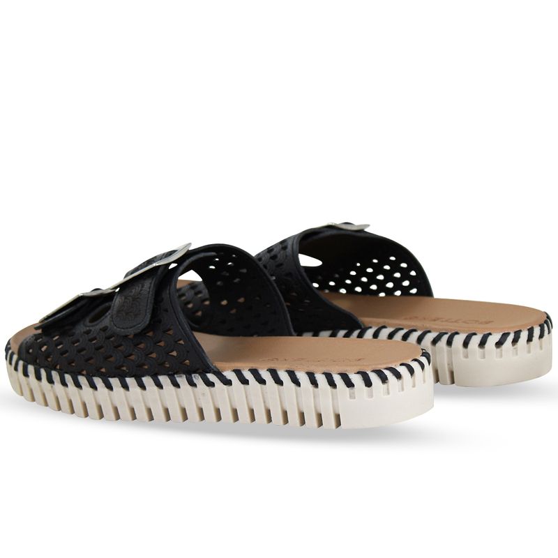 Sandália rasteira em couro burnish preto. Possui fivelas em metal onix sobre o pé com tira ajustável. Gáspea com detalhes a laser e solado com palmilha confortável.