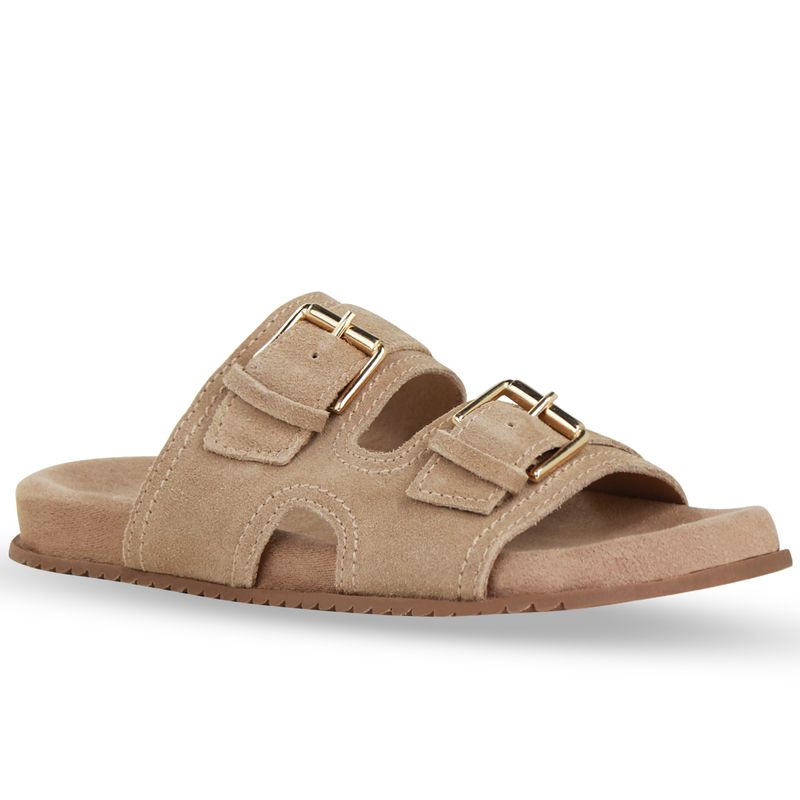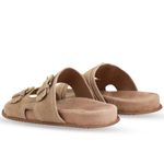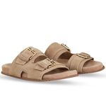 Sandália rasteira em couro camurça bege. De solado rasteiro e palmilha confortável com forro em camurça. Possui gáspea com detalhe de fivelas douradas sobre o pé.