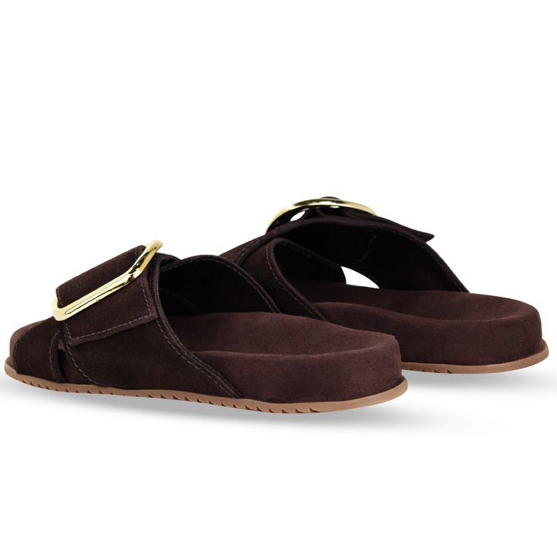 Sandália rasteira em couro camurça café. De solado rasteiro e palmilha confortável com forro em camurça. Possui gáspea com detalhe de fivela dourada sobre o pé.