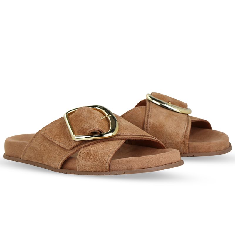 Sandália rasteira em camurça castanho. De solado rasteiro e palmilha confortável com forro em camurça. Possui gáspea com detalhe de fivela dourada sobre o pé.