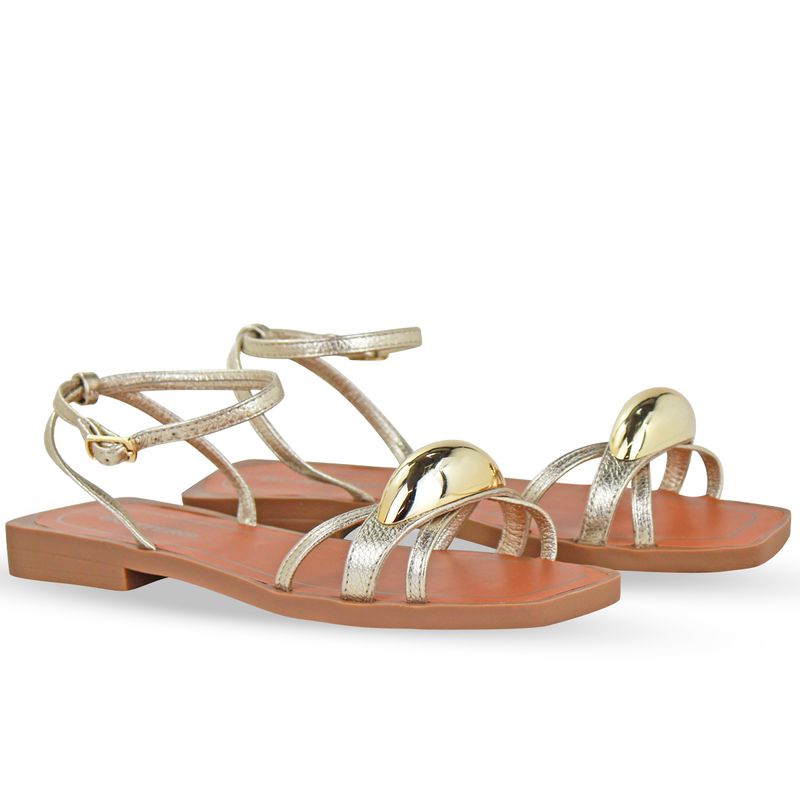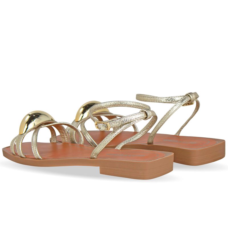 Sandália rasteira em couro metalizado roma dourado. De solado rasteiro bege. Possui traseiro aberto com tira ajustável e fivela de metal dourada. Gáspea com tiras finas e detalhe em metal dourado sobre o pé.