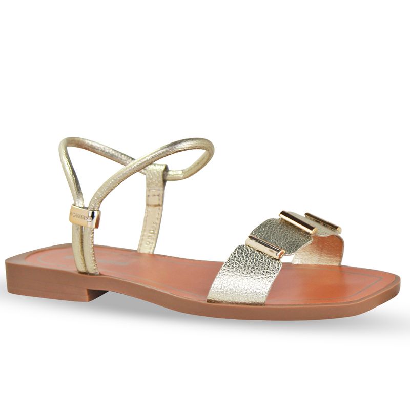 Sandália rasteira em couro metalizado roma dourado. De solado rasteiro bege. Possui traseiro aberto com detalhe em metal na lateral externa que possibilita o ajuste da tira que envolve o pé. Gáspea com tira larga e detalhe em metal dourado.