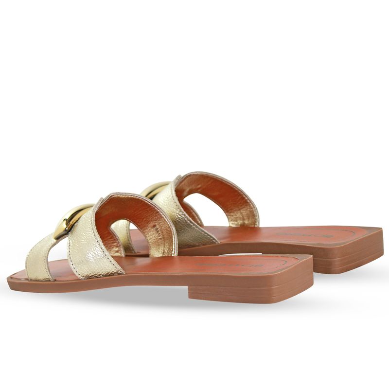 Sandália rasteira em couro metalizado roma dourado. De solado rasteiro bege. Gáspea com recortes nas laterais e enfeite de metal dourado.