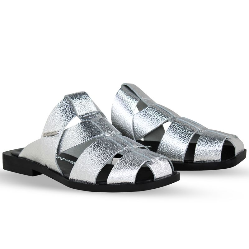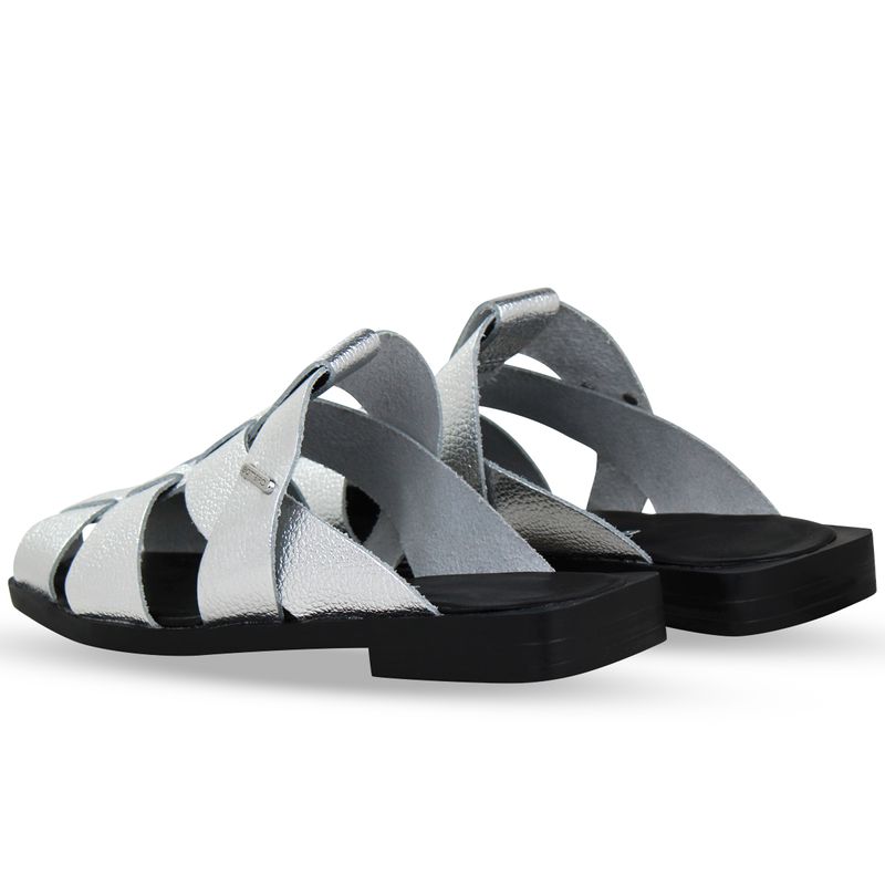 Sandália rasteira em couro metalizado roma prata. De solado rasteiro na cor preta com palmilha na cor preto. O modelo possui tira larga central sobre o pé e tiras largas na horizontal, exibindo parte do pé.