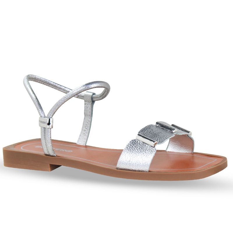 Sandália rasteira em couro metalizado roma prata. De solado rasteiro bege. Possui traseiro aberto com detalhe em metal na lateral externa que possibilita o ajuste da tira que envolve o pé. Gáspea com tira larga e detalhe em metal prata.