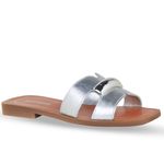 Sandália rasteira em couro metalizado roma prata. De solado rasteiro bege. Gáspea com recortes nas laterais e enfeite de metal prata.