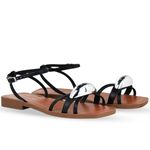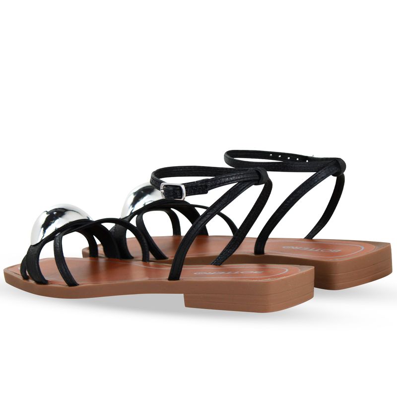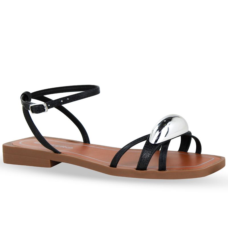 Sandália rasteira em couro metalizado roma preto. De solado rasteiro bege. Possui traseiro aberto com tira ajustável e fivela de metal prata. Gáspea com tiras finas e detalhe em metal prata sobre o pé.