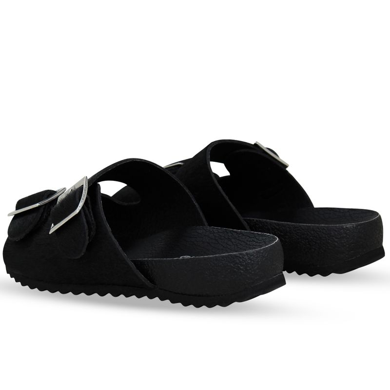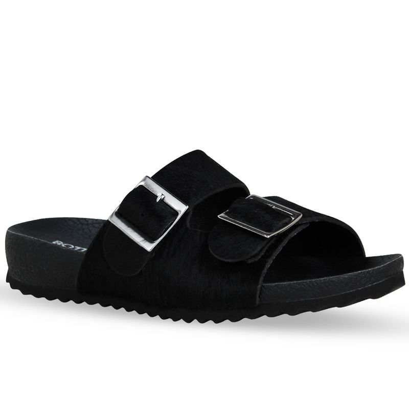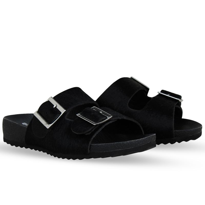 Sandália em couro poney preto. De solado rasteiro confortável. Gáspea possui fivelas e tiras ajustáveis que possibilitam ajustar, proporcionando maior conforto.
