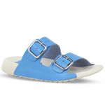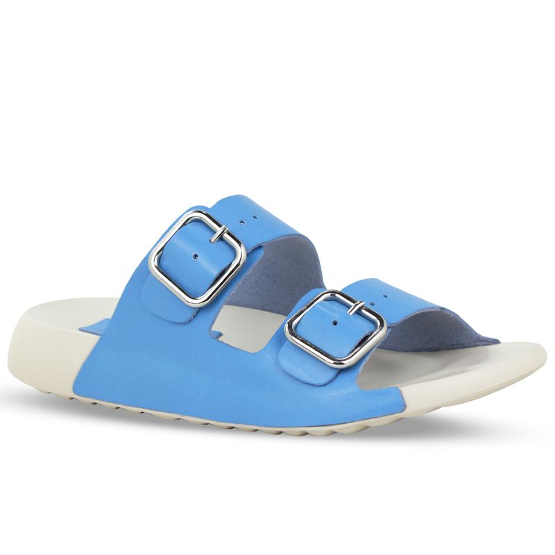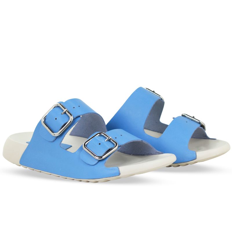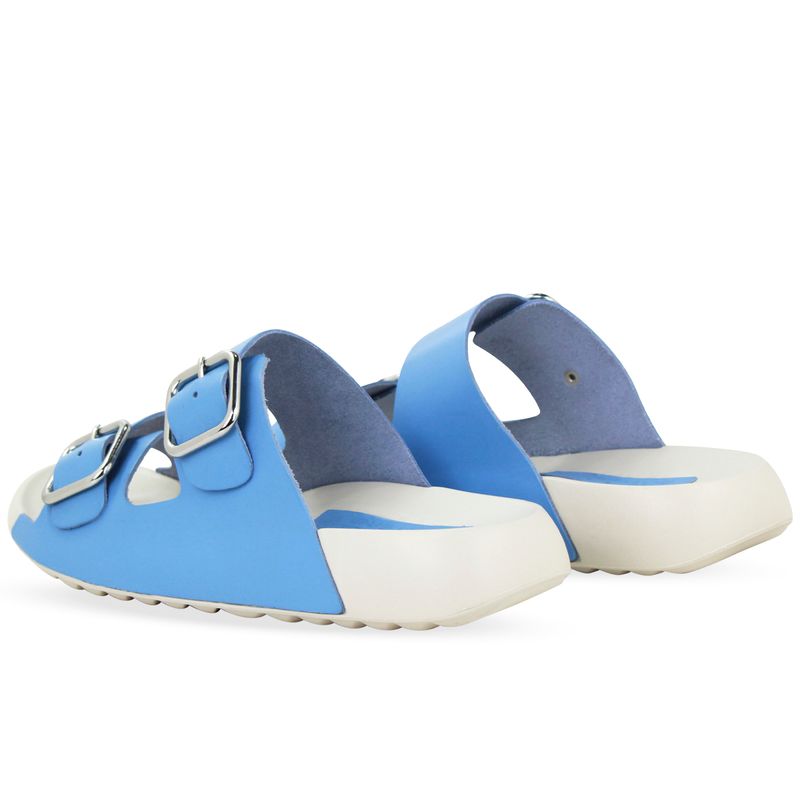 Sandália rasteira da linha Leve em couro atanado azul lago. De solado rasteiro em EVA branco, super confortável e leve. Possui gáspea em couro com tiras ajustável e fivela de metal prata.