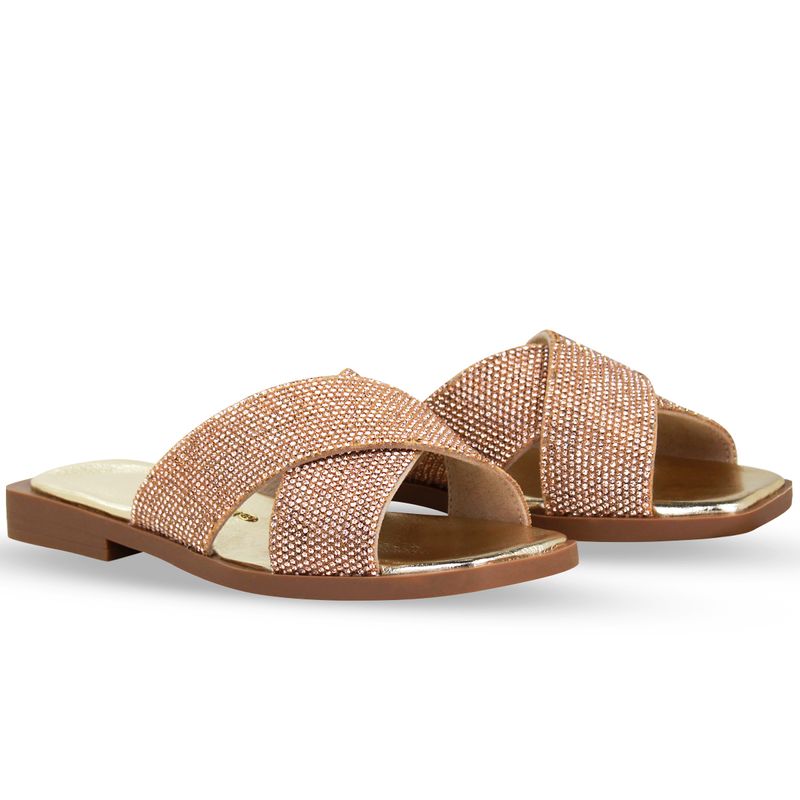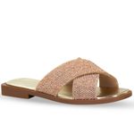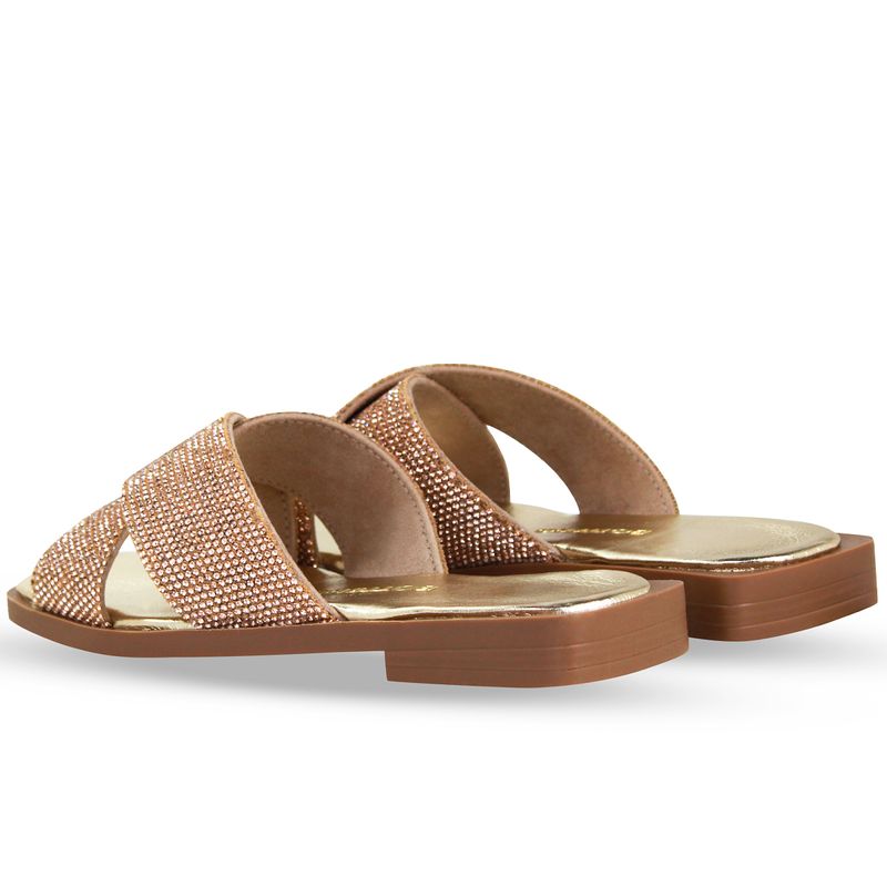 Sandália rasteira com strass dourado. De solado rasteiro na cor natural. Possui gáspea com tiras largas transpassadas sobre o pé.