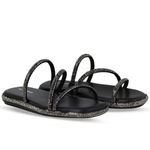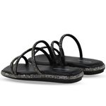Sandália rasteira com tira em couro summer burnish preto. De solado rasteiro com strass na lateral. Possui três tiras finas sobre o pé, uma das tiras possui detalhe em elástico, proporcionando ajuste ao pé. Modelo lindo e cheio de charme.