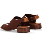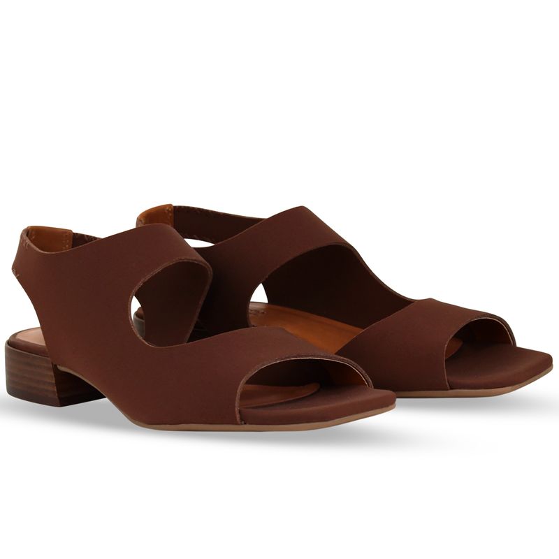 Sandália em tecido lycra marrom, que possibilita total ajuste ao calçar. De salto bloco baixo, possui gáspea inteira. Feita para conectar-se com oque realmente importa, você.