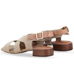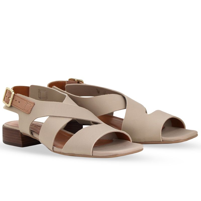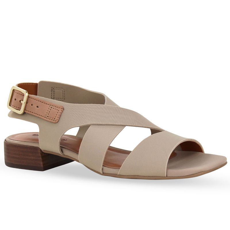 Sandália em tecido lycra nude, que possibilita total ajuste ao calçar. De salto bloco baixo. Possui traseiro aberto com tira ajustável e fivela de metal dourado. Gáspea com recortes nas laterais. Feita para conectar-se com oque realmente importa, você.