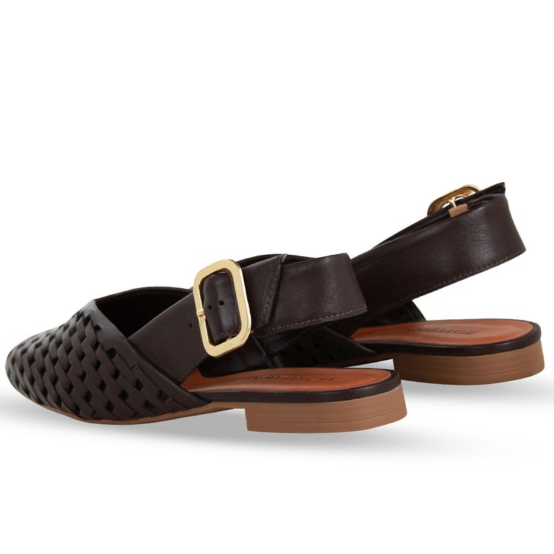 Sapatilha em couro atanado napoli marrom. De salto baixo e bico fino. Possui traseiro aberto com tira ajustável e fivela de metal dourada. Gáspea com material tramado.
