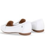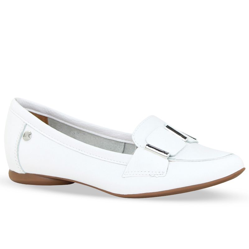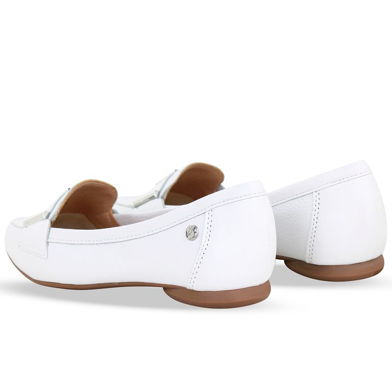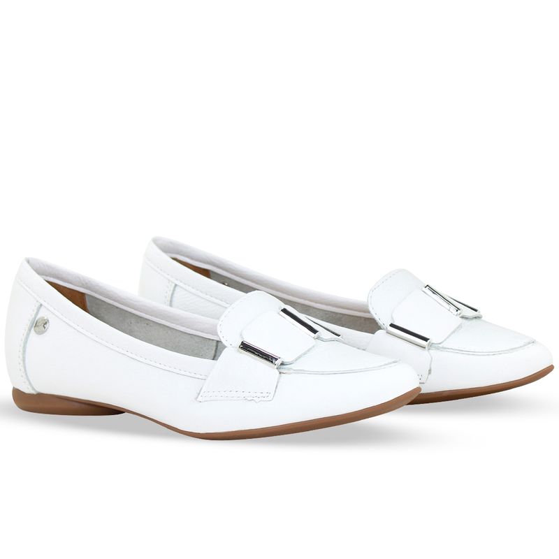 Sapatilha em couro burnish branco. De solado rasteiro e bico fino. Possui enfeite de metal prata sobre o pé.