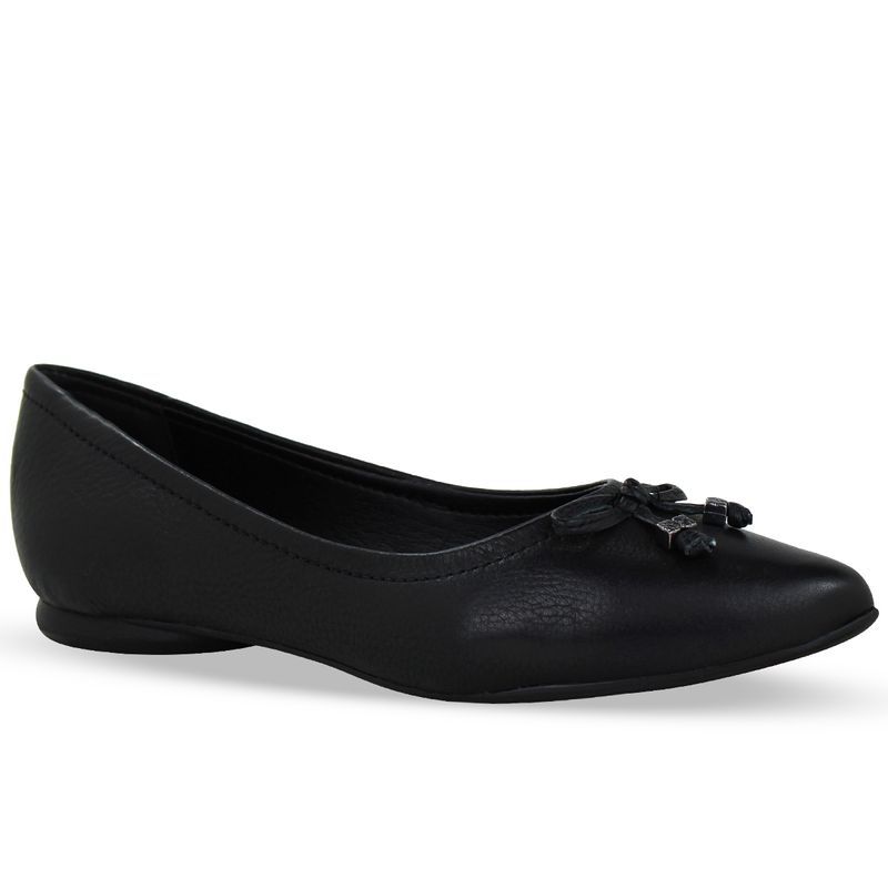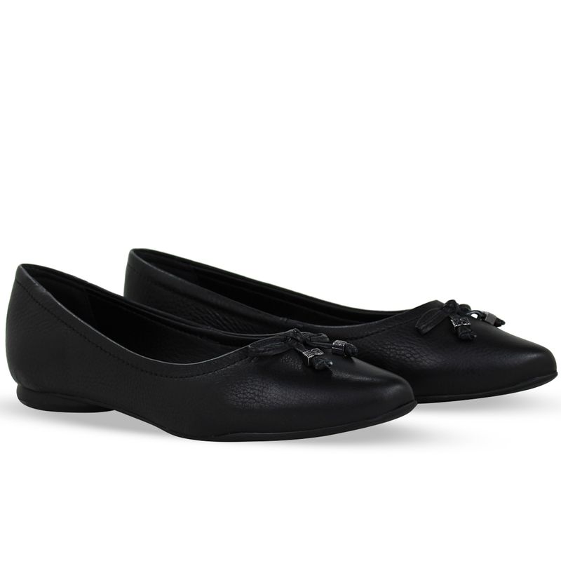Sapatilha em couro burnish preto. De solado rasteiro e bico fino. Possui delicado enfeite de laço sobre o pé.